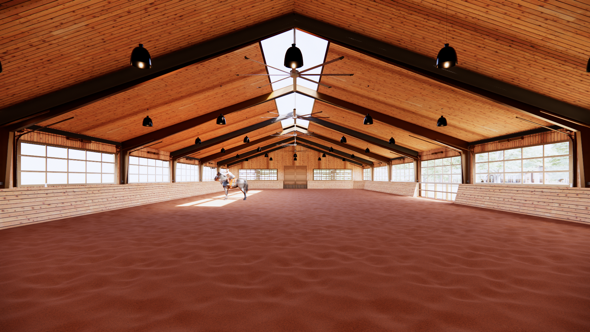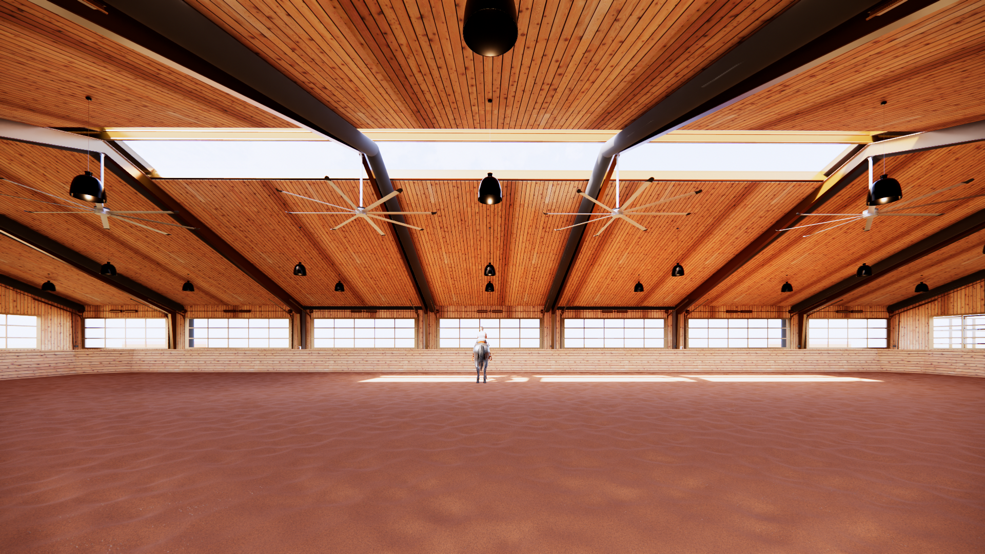 Natural light is carefully considered with a diffused light skylight that spans the length of the arena, providing soft, even illumination without harsh glare. This feature creates an inviting atmosphere for guests and equestrians alike, complementing the facility’s functionality. The strategic use of diffused light contributes to a sense of openness and warmth within the large-scale space.